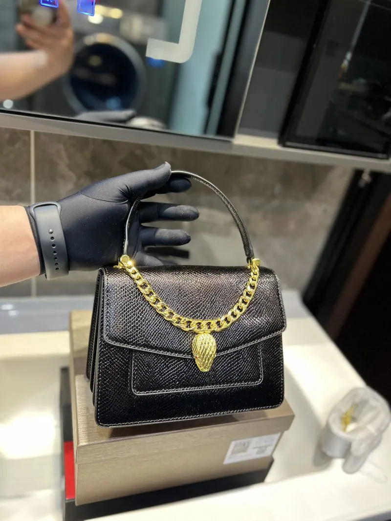 ¡El modelo más sexy de Bvlgari! Muchas famosas tienen el mismo estilo. El bolso es pequeño, redondo y regordete. La icónica hebilla con cabeza de serpiente está adornada con piedras de ágata. El suave bolso de piel de cordero resulta súper texturizado en la mano. Tiene un temperamento invencible. Lo comparto contigo, ¡no puedo hacerlo sola! talla t: 21 18
